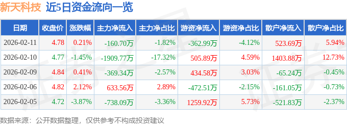 证券之星消息,截至2026年2月11日收盘,新天科技(300259)报收于4.78元,上涨0.21%,换手率1.57%,成交量18.4万手,成交额8809.4万元。
